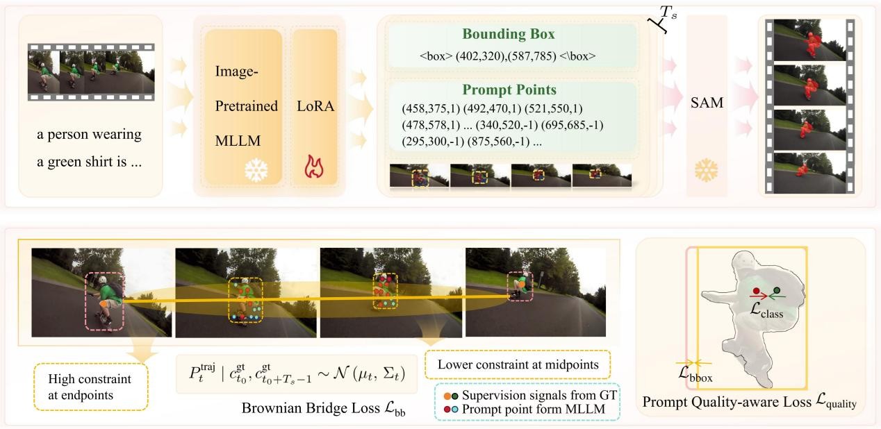 多模态大型语言模型(MLLM)与视觉基础模型的协同框架在图像理解任务中展现出卓越的性能,但在视频分割场景中却面临着严重的时序不一致性挑战。现有方法主要依赖于在静态图像上训练的MLLM来生成逐帧分割提示,忽略了视频运动的物理连续性。本文认为,视频理解任务的性能瓶颈源于对模型输出行为约束不足。因此,我们提出了一种时空协同优化机制,该机制仅通过约束MLLM的输出行为即可实现时间一致的视频分割,无需大规模视频预训练或复杂的架构修改。我们的方法包含两个互补的机制:布朗桥损失,将目标轨迹建模为端点约束的高斯过程以确保时间平滑性;以及几何感知提示质量损失,强制执行与目标结构的空间一致性。在指称表达视频分割(Referring Expression Video Segmentation)和推理视频分割(Reasoning Video Segmentation)任务上的实验表明,我们的方法在 Ref-YouTube-VOS、Ref-DAVIS-2017、MeVIS、A2d-Sentences、JHMDB-Sentences 和 ReVOS 基准测试中显著优于现有技术。这项工作证明,显式地对物理世界约束进行建模可以充分发挥静态训练的基础模型在动态视觉理解任务中的潜力。